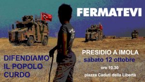 Il Comitato Pace e diritti del circondario imolese aderisce alla giornata mondiale di protesta contro l’attacco turco nel nord della Siria di cui è vittima il popolo curdo, per chiedere l’immediata cessazione dell’aggressione militare e invita pertanto a prendere parte al presidio che si terrà domani, sabato 12 ottobre, alle ore 10.30 in piazza Caduti della Libertà a Imola.