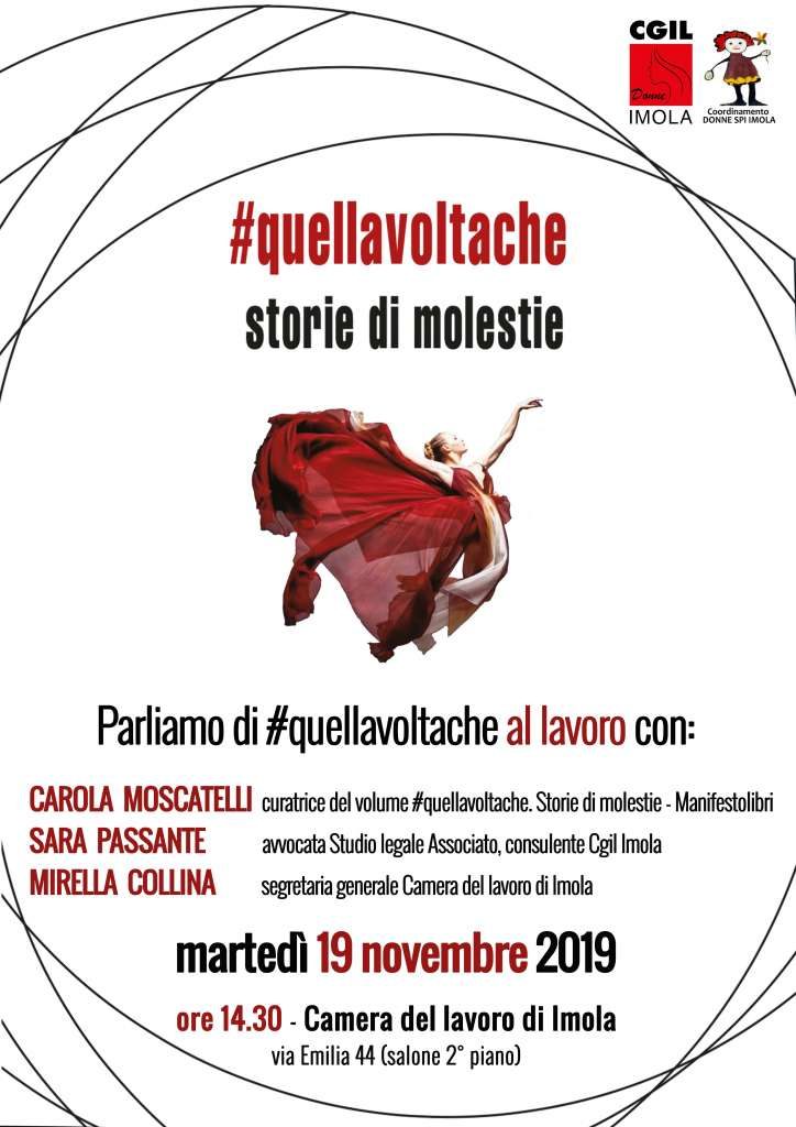 Martedì 19 novembre, alle ore 14.30, alla Camera del Lavoro di Imola, si terrà un Attivo delle delegate e dei delegati della Cgil di Imola, aperto alla cittadinanza, in cui parleremo di #quellavoltache al lavoro. Storie di molestie.