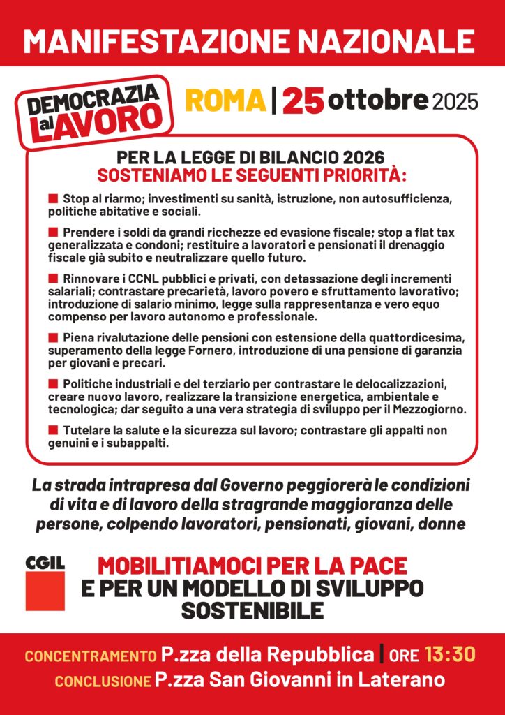Per aumentare salari e pensioni, Per dire NO al riarmo, Per investire su sanità e scuola, Per dire NO alla precarietà, Per una vera riforma fiscale. Concentramento a P.zza della Repubblica, ore 13:30; conclusione a P.zza San Giovanni in Laterano