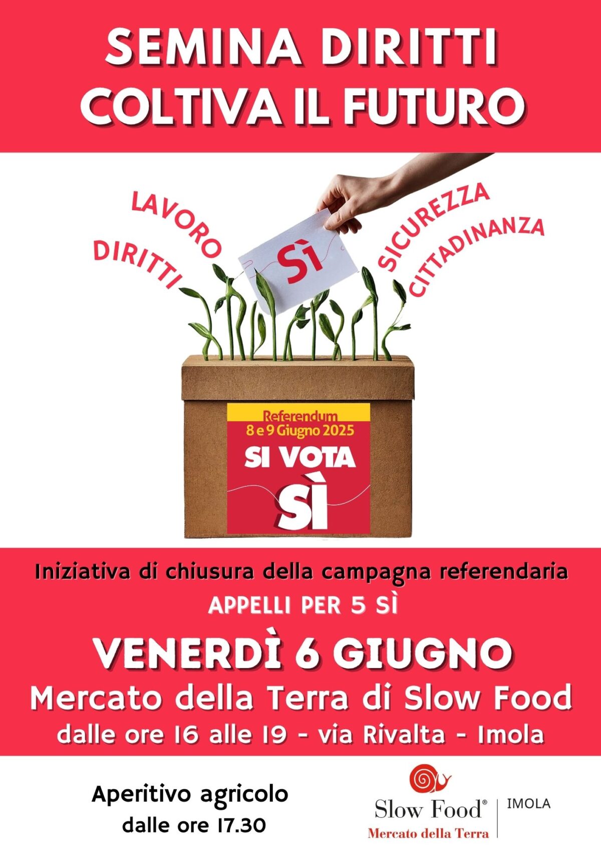 Iniziativa di chiusura della campagna referendaria. Gli ultimi appelli per invitare le elettrici e gli elettori ad andare a votare l’8 e il 9 giugno al referendum saranno lanciati venerdì 6 giugno dalle ore 16 alle 19, al mercato della Terra di Slow Food di Imola (in via Rivalta). Alle ore 17.30 sarà offerto un…Continua a leggereSemina diritti, coltiva il futuro: Vota 5 Sì