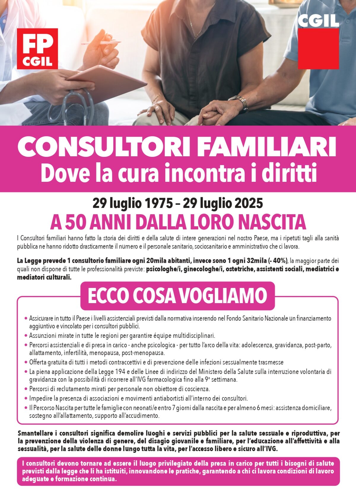 Oggi #29luglio ricorre il cinquantesimo anniversario della legge istitutiva dei Consultori pubblici familiari, la L. 405/1975. Da mezzo secolo rispondono ai bisogni di salute e sociali di intere generazioni. Consentono ad adolescenti, donne, coppie, famiglie di rivolgervisi gratuitamente per assistenza psicologica, consulenze, visite specialistiche e molto altro. I consultori hanno avuto e hanno un ruolo…Continua a leggereI consultori compiono 50 anni: difendiamoli dagli attacchi