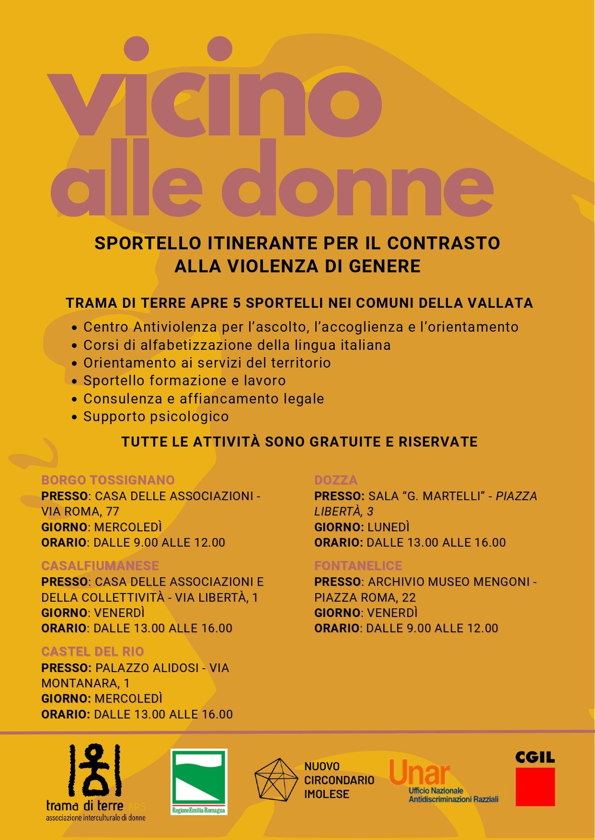 Trama di Terre ha attivato cinque nuovi sportelli di accoglienza per il contrasto alla violenza di genere e qualsiasi altra forma di abuso sulle donne nei comuni di Dozza, Castel del Rio, Fontanelice, Borgo Tossignano e Casalfiumanese. Il progetto, dal titolo “Vicino alle donne. Sportello itinerante per il contrasto alla violenza di genere”, intende raccogliere le richieste delle…Continua a leggereVicino alle donne: nuovi sportelli in Vallata contro la violenza di genere