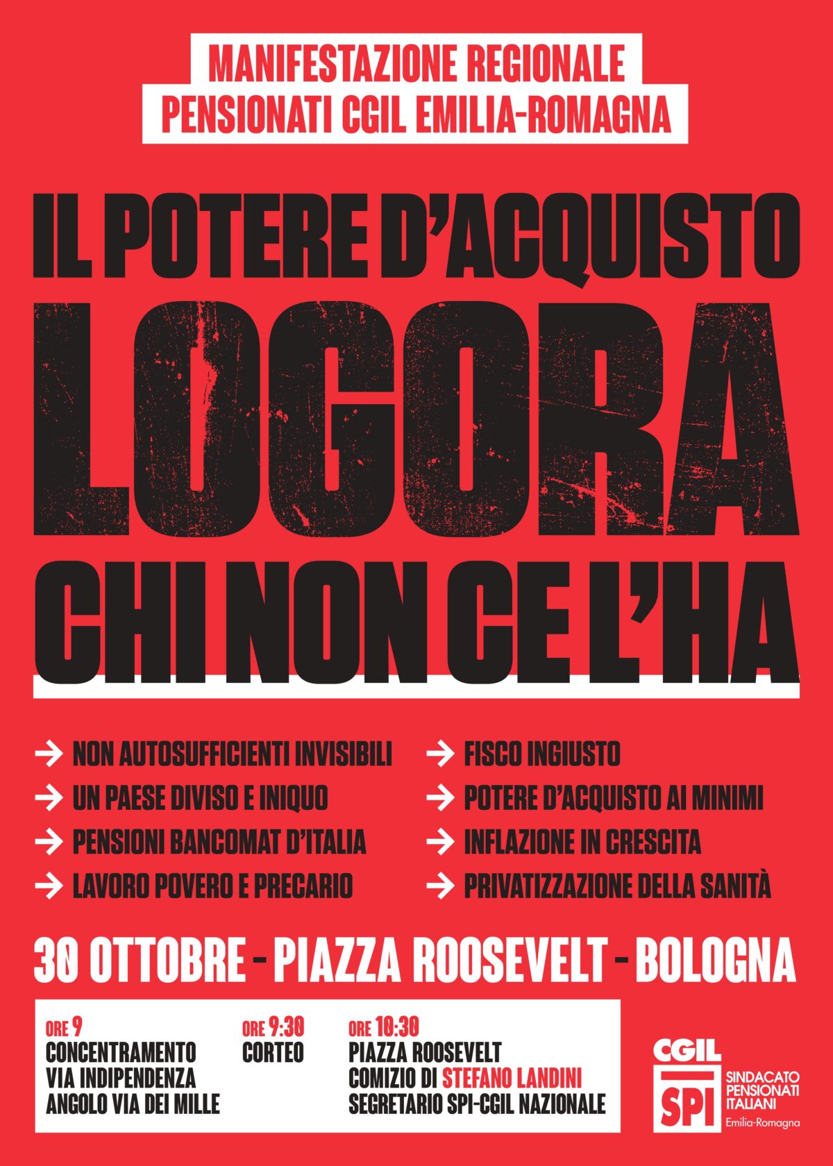 Il documento di bilancio pluriennale approvato dal governo condanna il Paese a cinque anni di austerità e stagnazione perché è privo di politiche idonee a promuovere la crescita del lavoro e dei salari e non risponde alle urgenze sociali. Per questo lo Spi-Cgil, il sindacato dei pensionati e delle pensionate, scende in piazza in tutta…Continua a leggereIl potere d’acquisto logora chi non ce l’ha: il 30 ottobre in piazza lo Spi Cgil