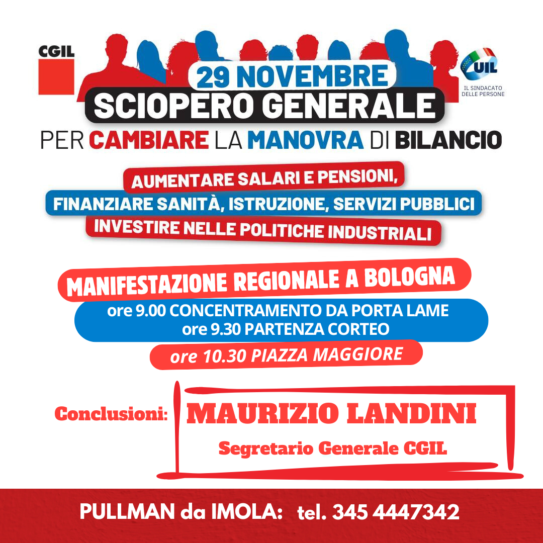 La mobilitazione è stata indetta da CGIL e UIL per chiedere di cambiare la manovra di bilancio, considerata del tutto inadeguata a risolvere i problemi del paese, e per rivendicare l’aumento del potere d’acquisto di salari e pensioni e il finanziamento di sanità, istruzione, servizi pubblici e politiche industriali. MANIFESTAZIONE REGIONALE A BOLOGNA CON MAURIZIO…Continua a leggereSciopero generale 8 ore venerdì 29 novembre