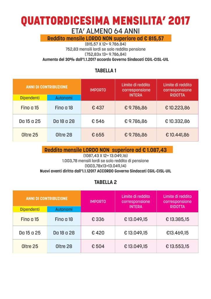 La quattordicesima nasce grazie all’accordo sindacati-governo del 2007 e fino a luglio 2016 è stata attribuita alle pensioni che non superavano una volta e mezza il trattamento minimo. Con l’accordo siglato a settembre 2016 da governo e sindacati, da luglio prossimo la somma aggiuntiva sarà incrementata del 30 per cento per i redditi non superiori a una volta e mezza il trattamento minimo ed estesa anche a chi ha un reddito compreso tra una volta e mezza e due volte il trattamento minimo.