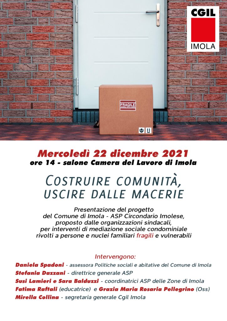 Mercoledì 22 dicembre, alle ore 14 nel salone della Camera del Lavoro di Imola. si terrà un incontro, aperto alla cittadinanza, per presentare il progetto del Comune di Imola e Asp Circondario Imolese “Costruire comunità, uscire dalle macerie”, proposto dalle organizzazioni sindacali, per interventi di mediazione sociale condominiale, rivolti a persone e nuclei familiari fragili e vulnerabili.