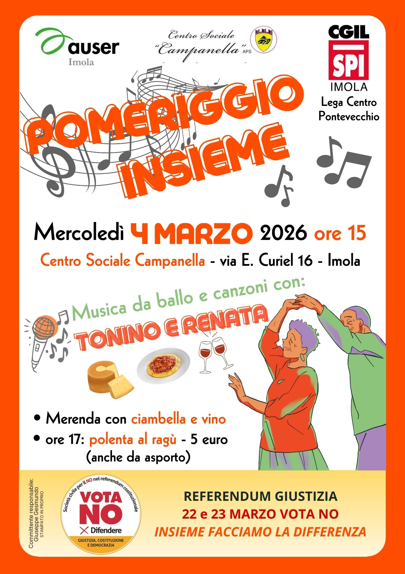 Mercoledì 4 marzo 2026 alle ore 15, al Centro Sociale Campanella di Imola (via E. Curiel 16), la Lega Spi Cgil Centro-Pontevecchio e Auser Imola, vi invitano a trascorrere un “Pomeriggio Insieme”, all’insegna della musica e della convivialità.