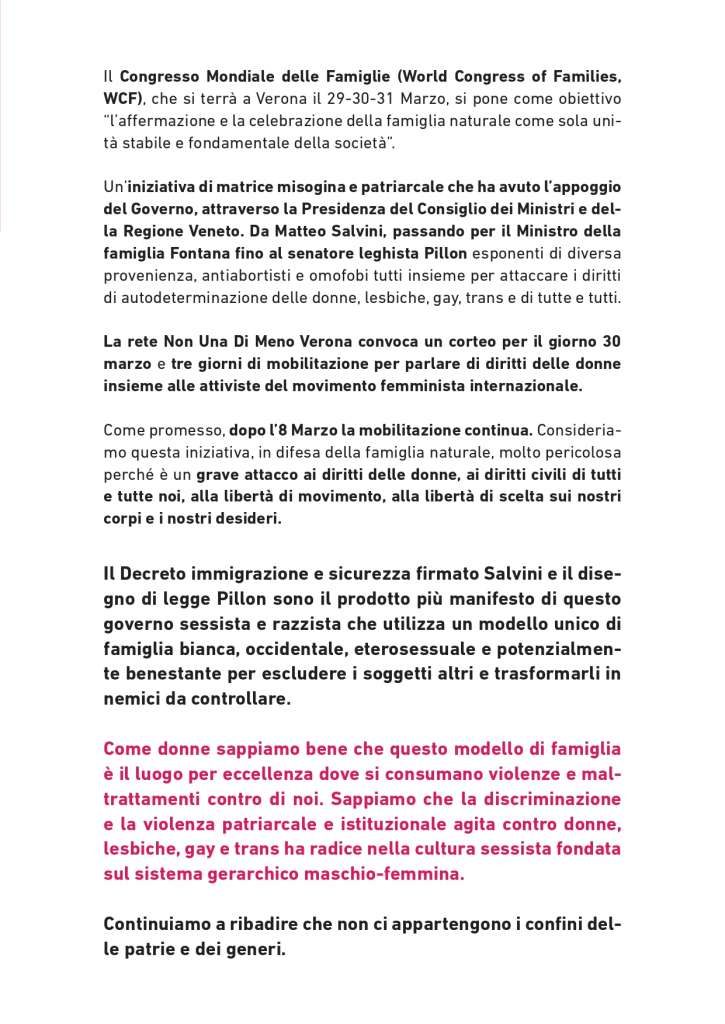 La mobilitazione è stata organizzata da associazioni e movimenti per contrastare il tentativo delle destre mondiali, a partire da ministri del governo italiano, di “affermare, celebrare e difendere la famiglia naturale come sola unità stabile e fondamentale della società”, come si legge sul sito del congresso.