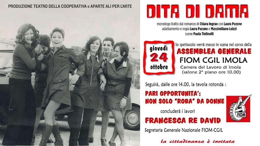 La discussione sarà introdotta e stimolata dallo spettacolo teatrale “Dita di Dama”, interpretato da Laura Pozone, che con Massimiliano Loizzi ha curato adattamento e regia dall’omonimo romanzo di Chiara Ingrao. Un monologo che narra, con un tocco di comicità, la storia di Maria entrata in fabbrica a 18 anni, nel 1969, e tra ritmi massacranti, scioperi, amori e ribellioni ci accompagna nell’Italia dello Statuto dei Lavoratori.