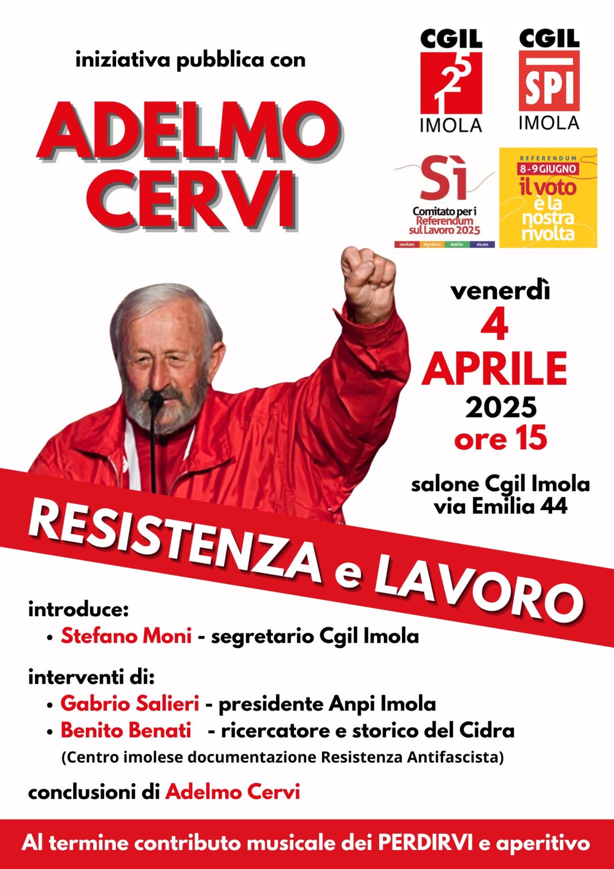 ADELMO CERVI sarà protagonista dell’iniziativa pubblica “Resistenza e lavoro”, in programma venerdì 4 aprile, alle ore 15, alla Camera del Lavoro di Imola, nel salone in via Emilia 44,nell’ambito degli eventi per i 125 anni della Camera del Lavoro e l’80° della Liberazione. Dopo l’introduzione di Stefano Moni, interverranno Gabrio Salieri, presidente Anpi Imola, e…Continua a leggere“Resistenza e Lavoro”, il 4 aprile con Adelmo Cervi