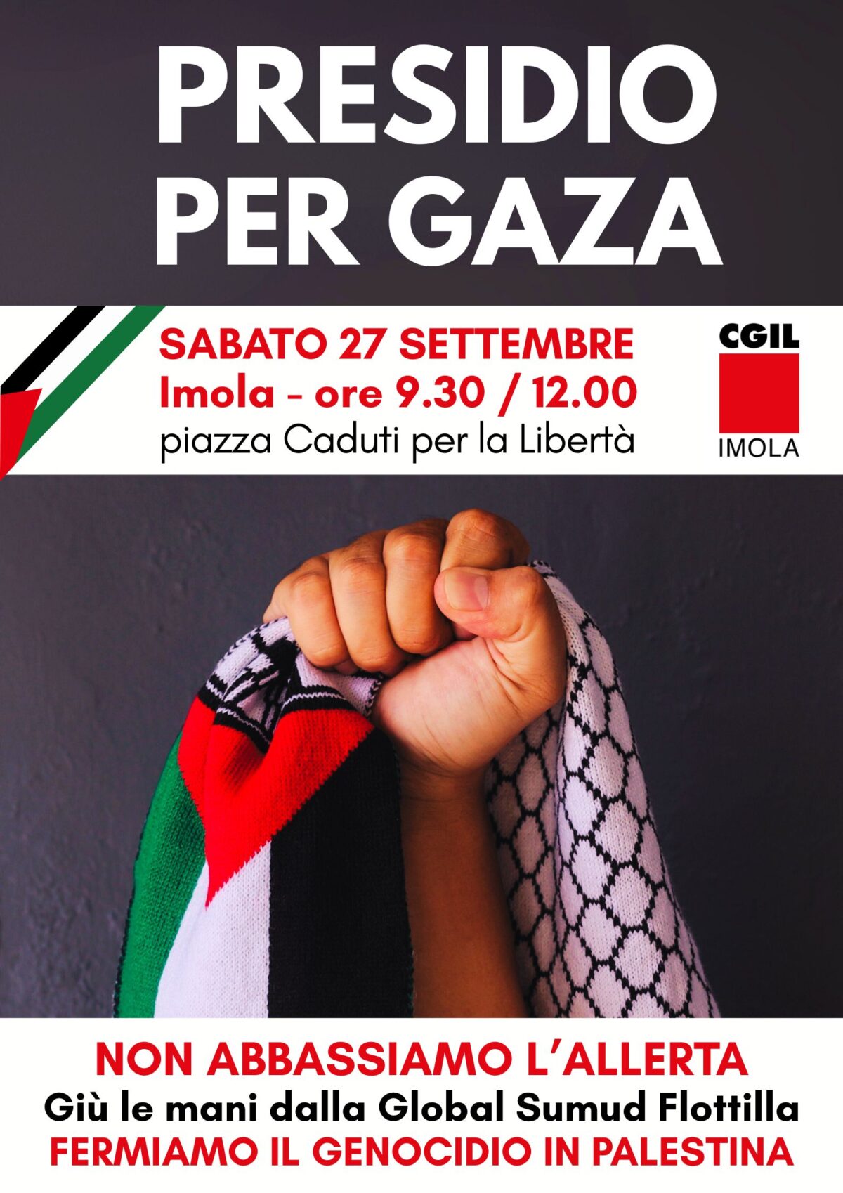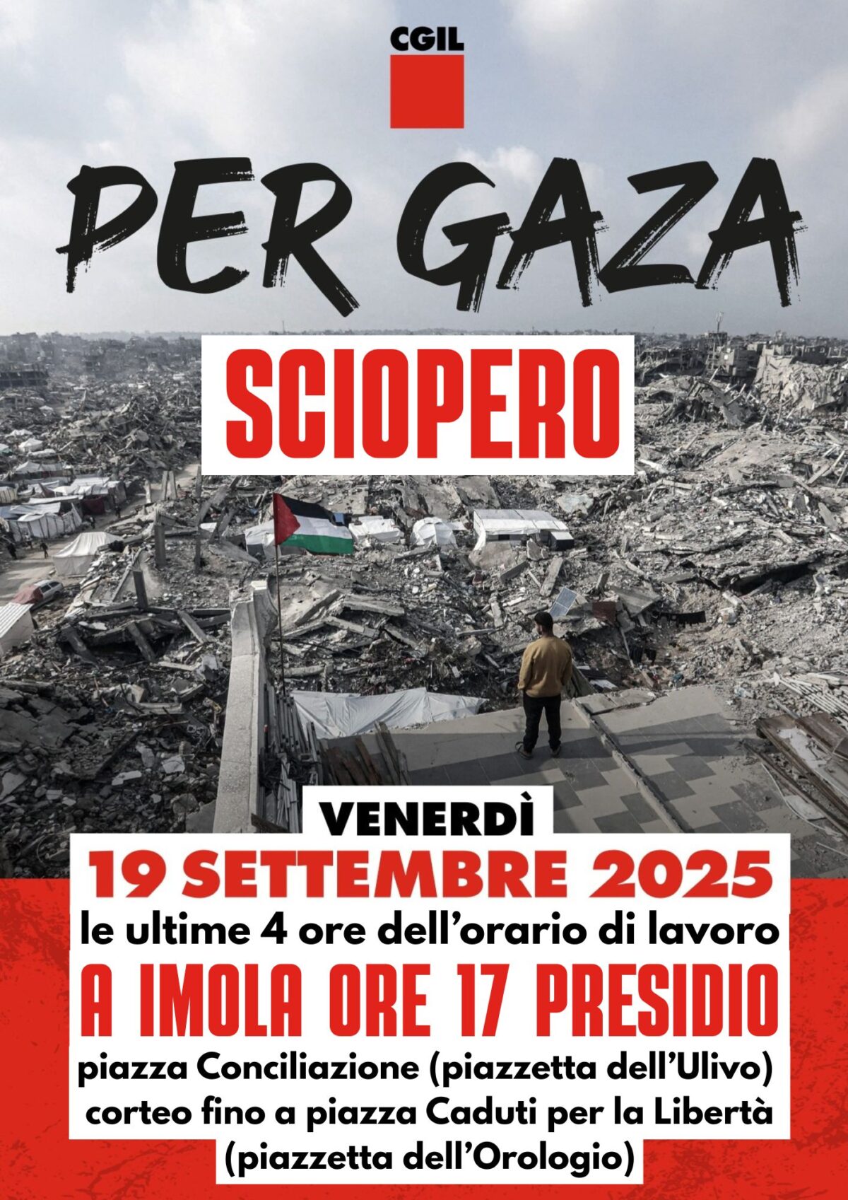 Venerdì 19 settembre 4 ore (le ultime 4 del turno) La CGIL si mobilita contro l’invasione israeliana a Gaza. Venerdì 19 settembre sarà una giornata di mobilitazione nazionale con manifestazioni, scioperi e presidi. A Imola, come in tutta l’Emilia Romagna, sciopero di 4 ore (le ultime 4 del turno) in tutti i settori privati (sono esclusi i servizi…Continua a leggerePer Gaza: sciopero e presidio