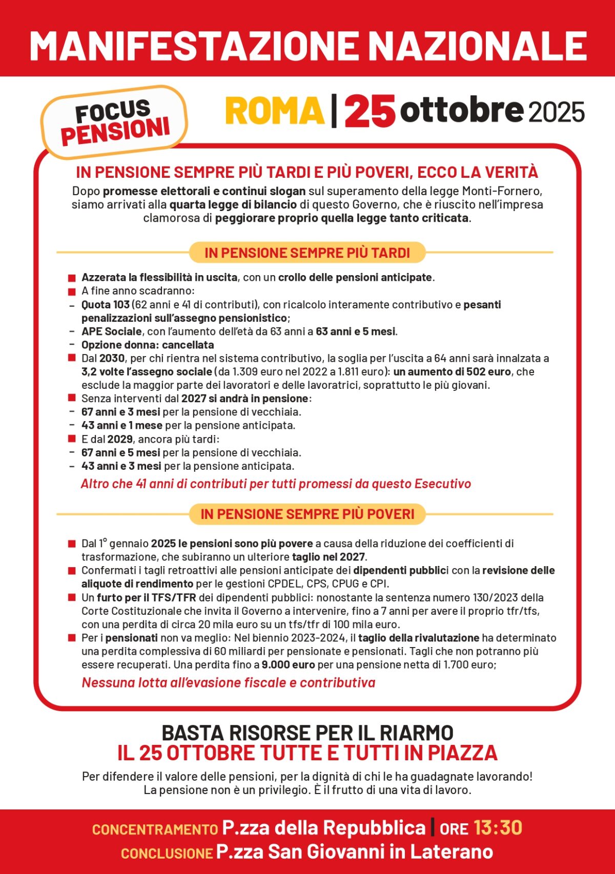 MANIFESTAZIONE NAZIONALE: ROMA | 25 ottobre 2025 IN PENSIONE SEMPRE PIÙ TARDI E PIÙ POVERI, ECCO LA VERITÀ Dopo promesse elettorali e continui slogan sul superamento della legge Monti-Fornero,siamo arrivati alla quarta legge di bilancio di questo Governo, che è riuscito nell’impresaclamorosa di peggiorare proprio quella legge tanto criticata. IN PENSIONE SEMPRE PIÙ TARDI 🔴…Continua a leggereFocus Pensioni