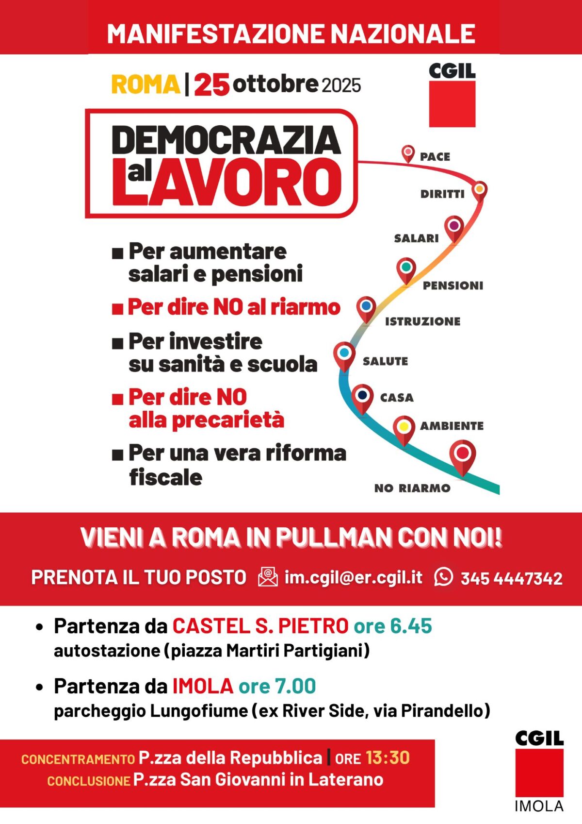DEMOCRAZIA AL LAVOROPer aumentare salari e pensioni, Per dire NO al riarmo, Per investire su sanità e scuola, Per dire NO alla precarietà, Per una vera riforma fiscale. Concentramento a P.zza della Repubblica, ore 13:30; conclusione a P.zza San Giovanni in Laterano Pullman Cgil da Imola (partenza ore 7 parcheggio Lungofiume, ex Riverside, via Pirandello)…Continua a leggereManifestazione nazionale a Roma 25 ottobre