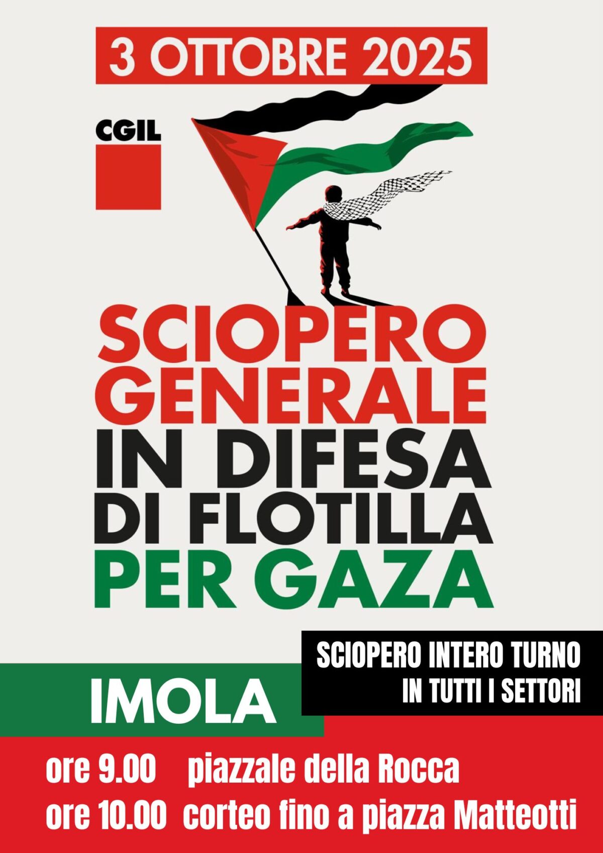 Intera giornata di sciopero e manifestazione dalle ore 9 concentramento nel piazzale della Rocca “L’aggressione contro navi civili che trasportavano cittadine e cittadini italiani, rappresenta un fatto di gravità estrema. Un colpo inferto all’ordine costituzionale stesso che impedisce un’azione umanitaria e di solidarietà verso la popolazione palestinese sottoposta dal governo israeliano ad una vera e…Continua a leggereSciopero generale domani 3 ottobre e corteo a Imola