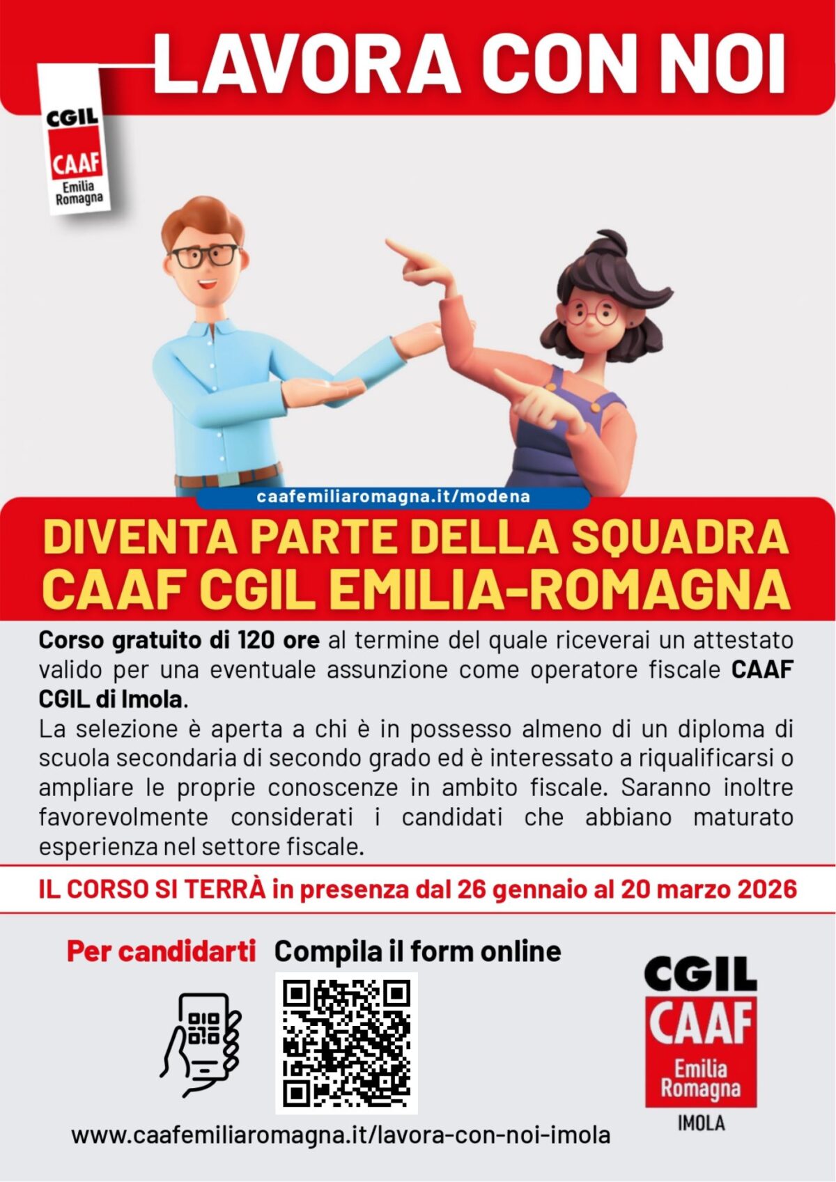 Il Caaf Cgil Emilia ricerca personale stagionale per la campagna fiscale 2026 nelle sedi del comprensorio imolese. Corso gratuito di 120 ore al termine del quale riceverai un attestato valido per una eventuale assunzione come operatore fiscale CAAF CGIL di Imola.La selezione è aperta a chi è in possesso almeno di un diploma di scuola…Continua a leggereLavora con noi, unisciti al Caaf Cgil Emilia Romagna