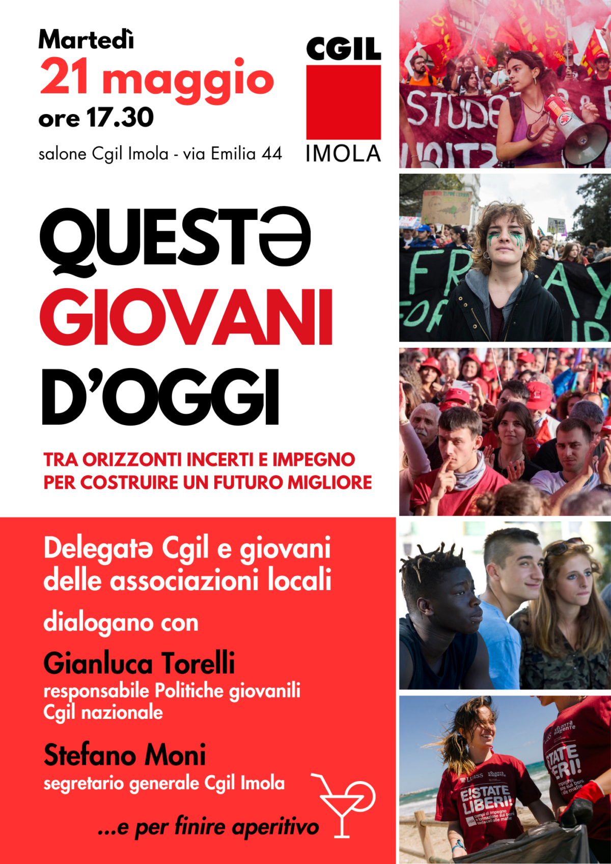 Tra orizzonti incerti e impegno per costruire un futuro migliore Incontro in programma martedì 21 maggio, alle ore 17.30, nel salone della Camera del Lavoro di Imola (via Emilia 44). Delegati e delegate Cgil e giovani delle associazioni locali dialogano con Gianluca Torelli, responsabile Politiche giovanili della CGIL nazionale, e Stefano Moni segretario della Cgil di Imola, per un…Continua a leggere“Questә giovani d’oggi”