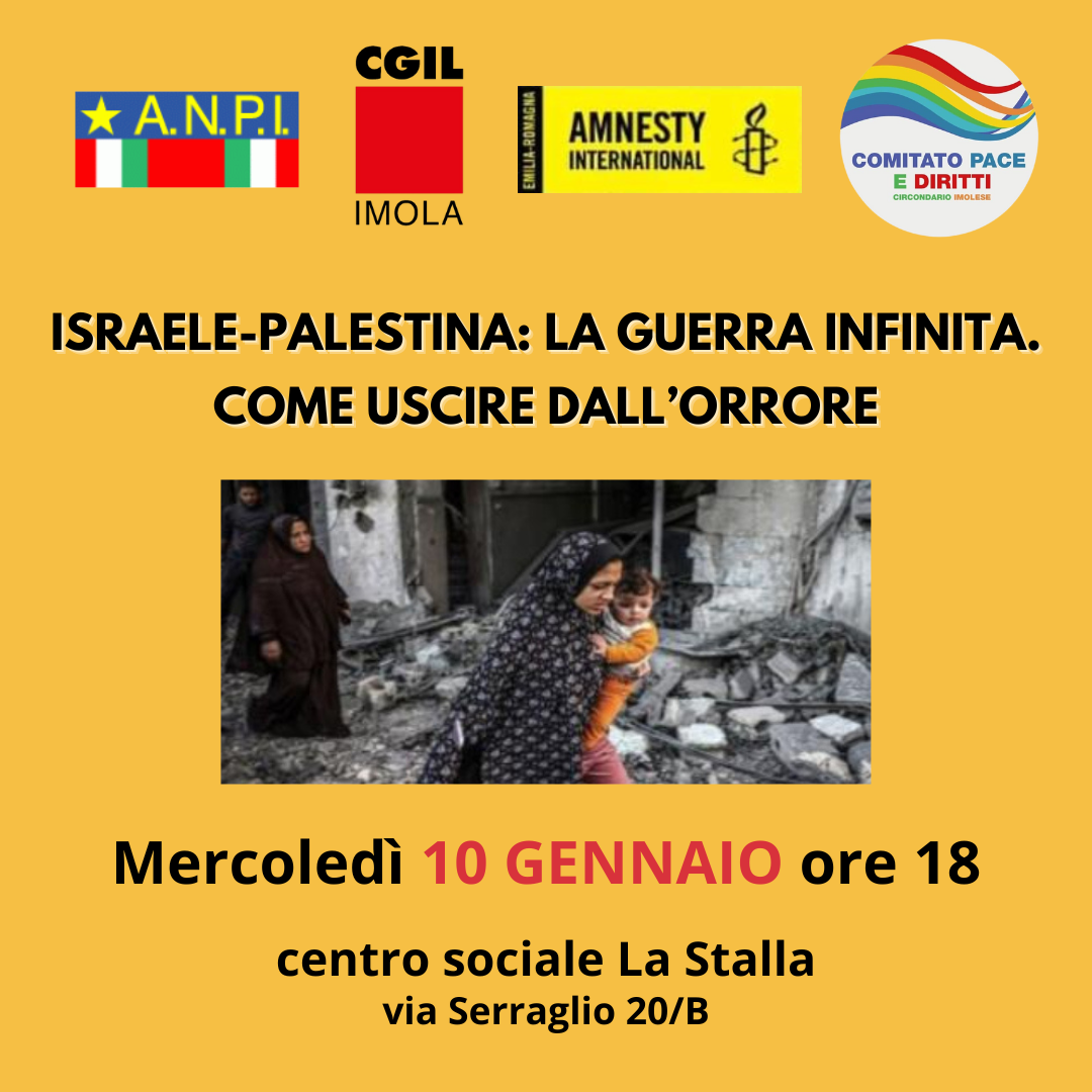 Mercoledì 10 gennaio ore 18, al centro sociale La Stalla a Imola, incontro “Israele-Palestina: la guerra infinita. Come uscire dall’orrore”, organizzato da Valter Galavotti, insieme a CGIL Imola, ANPI Imola, Amnesty International Emilia Romagna e Comitato Pace e Diritti del circondario imolese. Un incontro che vuole promuovere il confronto e l’informazione sull’attuale crisi israelo-palestinese, con…Continua a leggereIsraele-Palestina: la guerra infinita. Come uscire dall’orrore