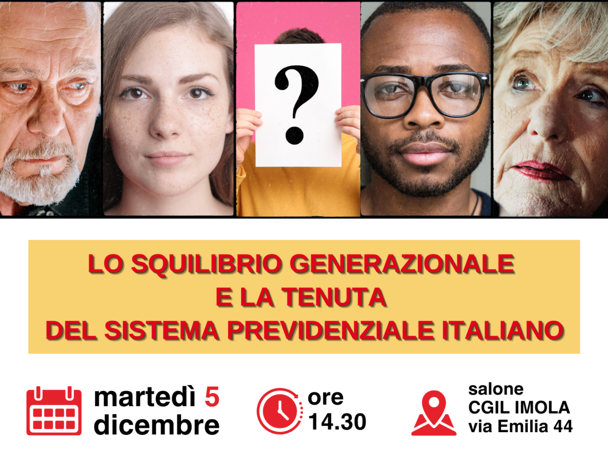 Iniziativa Spi e Cgil Imola, co-promossa da Spi Cgil Emilia Romagna: martedì 5 dicembre “La crisi demografica, causata dal rapporto tra la longevità e la bassa natalità, è un elemento di forte preoccupazione per la tenuta del nostro sistema previdenziale – spiega Angelo Gentilini, segretario Spi Cgil Imola -. Serve un nuovo patto tra le…Continua a leggereLo squilibrio generazionale e la tenuta del sistema previdenziale italiano