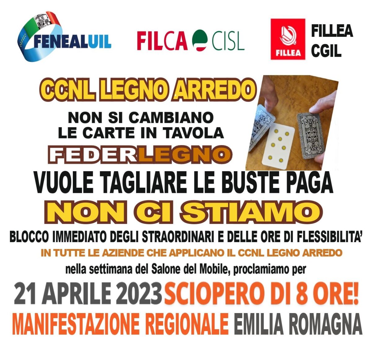 Venerdì 21 aprile sciopero nazionale di Fillea CGIL, Filca CISL e Feneal UIL, le sigle dell’Emilia – Romagna manifesteranno a Forlì: Federlegno deve riconoscere gli adeguati aumenti salariali a fronte dell’aumento dei profitti. Venerdì 21 aprile 2023, si svolgerà lo sciopero nazionale dei lavoratori e delle lavoratrici del comparto legno e arredo indetto dalle segreterie…Continua a leggereLegno e arredo, è sciopero nazionale