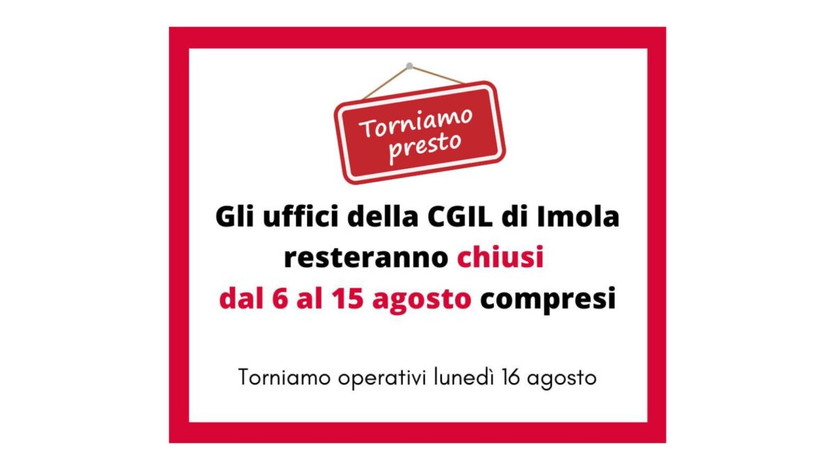 Torniamo operativi lunedì 16 agostoContinua a leggereChiusura uffici Cgil Imola dal 6 al 15 agosto compresi