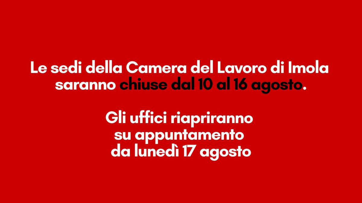 Le sedi della Camera del lavoro di Imola resteranno chiuse dal 10 al 16 agosto. Gli uffici riapriranno su appuntamento lunedì 17 agosto.Continua a leggereChiusura sedi Cgil Imola dal 10 al 16 agosto