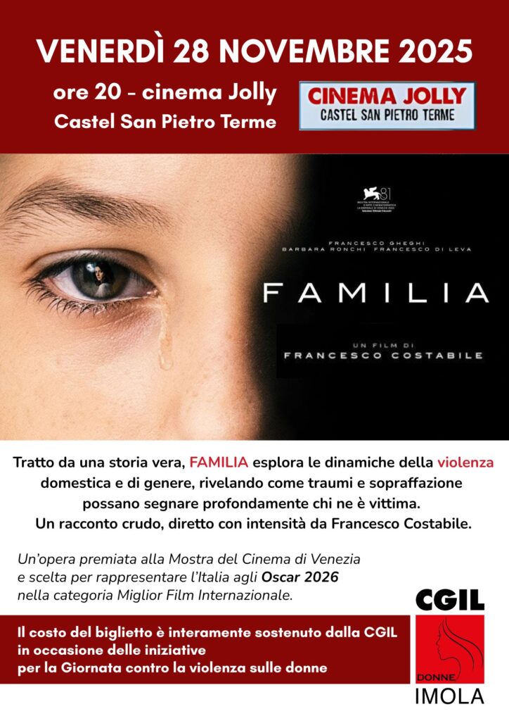 Venerdì 28 NOVEMBRE 2025 – ore 20 – cinema Jolly – Castel San Pietro Terme Tratto da una storia vera, FAMILIA esplora le dinamiche della violenza domestica e di genere,… - Cgil rafforza la presenza nelle sedi di Borgo, Pedagna, Poggio Piccolo e Castel San Pietro