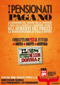 Pesanti tagli ai servizi socio-assistenziali, potere d’acquisto delle pensioni ridotto, nuovi ticket, più tasse per tutti eccezion fatta per chi le evade. Questo il risultato delle due manovre estive approvate dal governo. Gli effetti si cominciano sentire. L’aumento dell’Iva ha, ad esempio, fatto impennare ben più dell’uno per cento i prezzi di tanti prodotti. Un peso che ricchi ed evasori sentono poco, non è così invece per milioni di pensionati e di famiglie. E questo è niente, perché la finanziaria farà sentire i suoi effetti soprattutto dal 2012 a 2014. Per tentate di cambiare il futuro di un Paese che di questo passo rischia di sprofondare lo Spi-Cgil ha organizzato una manifestazione nazionale che si terrà a Roma il 28 ottobre a piazza del Popolo. «Scendiamo in piazza – dichiara il segretario generale dello Spi imolese, Daniele Dardi – perchè ancora una volta a pagare le conseguenze di politiche sbagliate sono le fasce più deboli del Paese. L’aumento delle tasse e dei costi dei servizi ai cittadini e l’introduzione di nuovi ticket sanitari sono misure inaccettabili che contestiamo». Cambiare le misure prese dal governo è ancora possibile a patto, così recita l’appello dei pensionati, che «nessun dorma!».